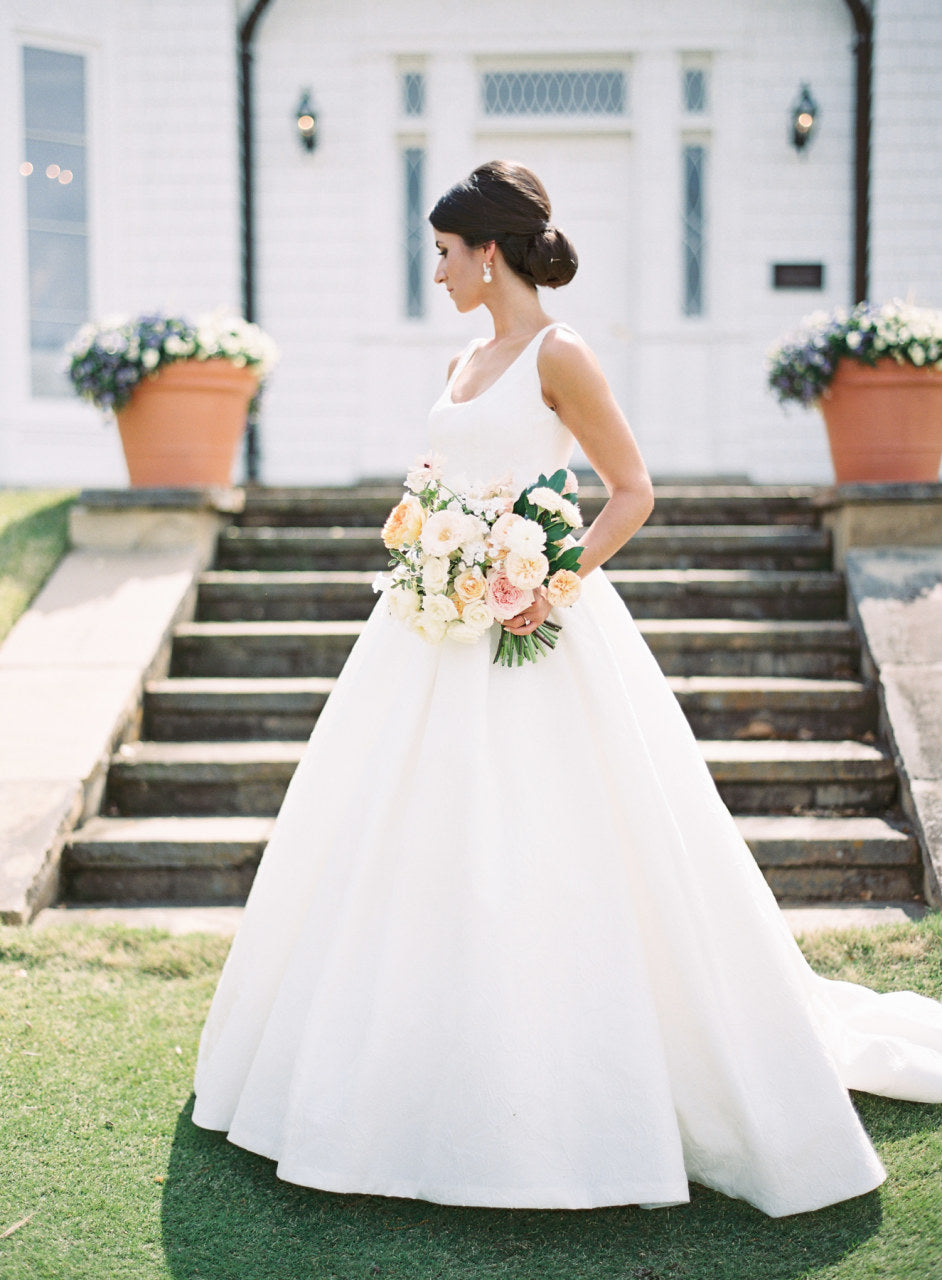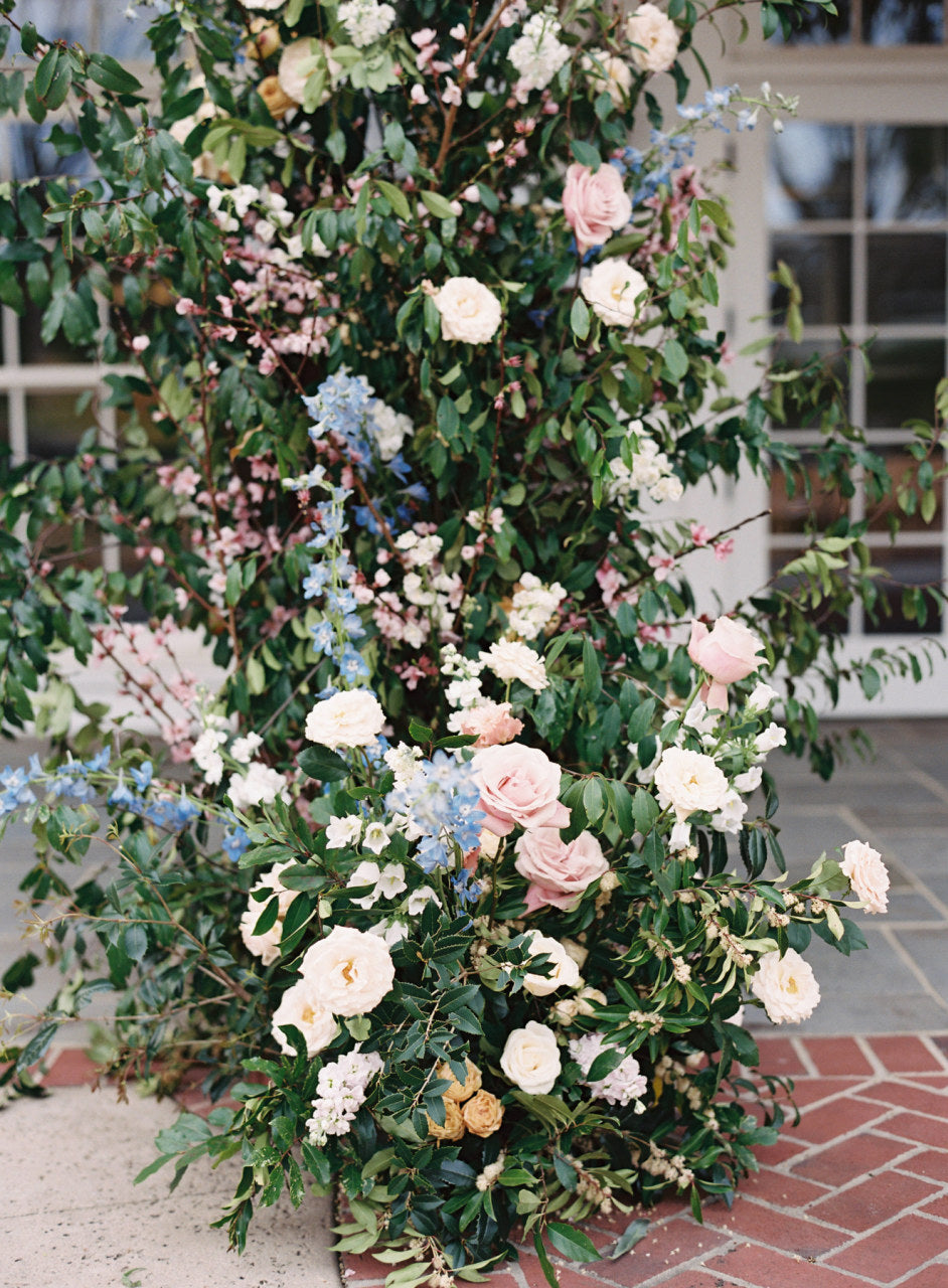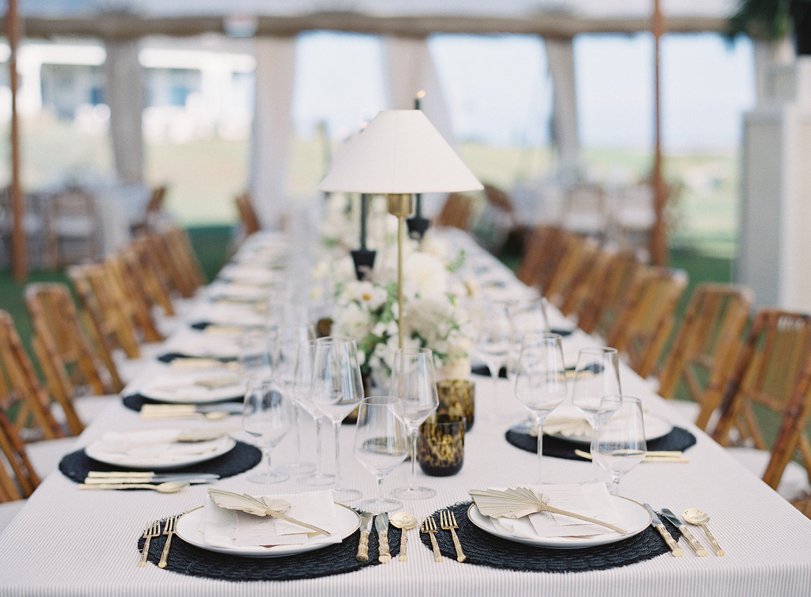 When you’re setting up at Kiawah Ocean Course, it’s like stepping into a postcard. With a sailcloth tent on the edge of the beach, it makes for gorgeous views, but oh man the wind that day! Luckily the giant palm arrangements we created atop 10-foot ladders were solid on the massive columns designed by Host & Haven. The huge planters for the ceremony on the crest of the hill were a different story. You would never know it from the pictures, but it took a person behind each planter to anchor the arrangements during the ceremony.