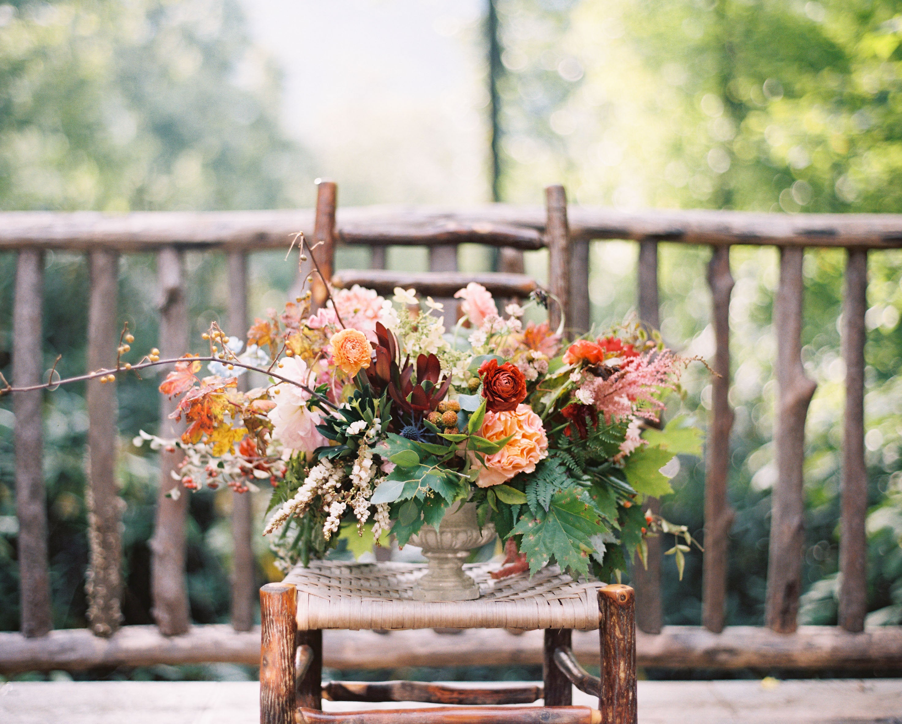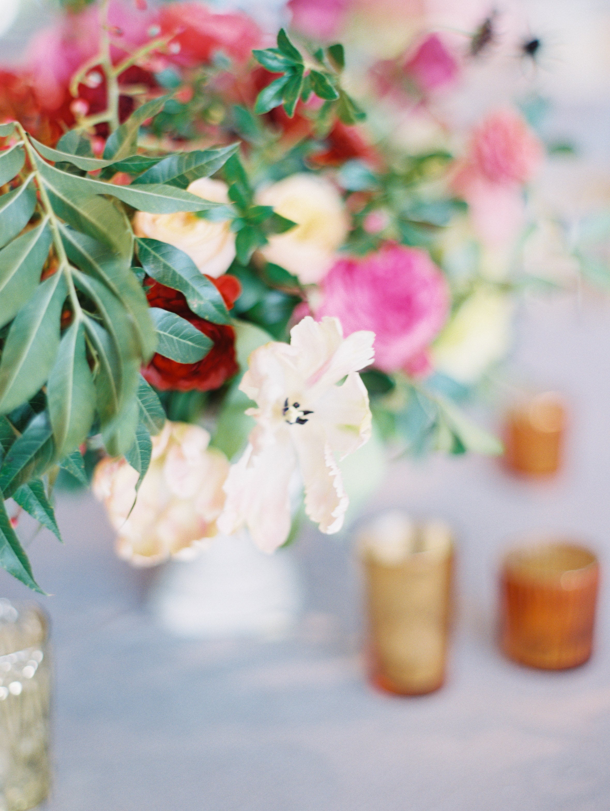We are extra proud of this wedding because it was published in a print edition of Martha Weddings. September weddings are really fun because they still have the bounty of summer flowers but autumn color is starting to make an appearance. Jessica, the wedding planner, came up with this fresh take on a colorful September color palette: deep sorbet pinks and peaches juxtaposed with autumn burgundies, rusty reds, and a tinge of blue and cobalt. Fun fact, Michelle’s bridal bouquet with that king protea is one of my all time favorites so I had a painting commissioned of it by artist Lulie Wallace.