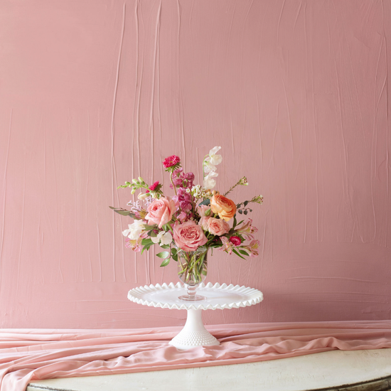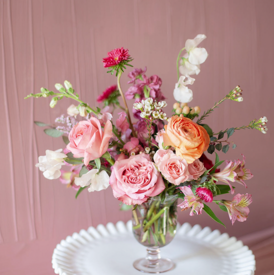 The Kitty, a petite vase arrangement designed in a footed, pink glass vase. Perfect for a small coffee table, side table or a little spot in your kitchen. Please see here for other offerings in the Valentine's collection and here for more information on Maison Boissier.